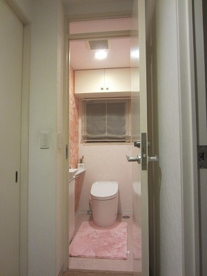 川崎市S邸トイレ改修工事 BEFORE リフォームOBさん宅のシャワートイレの調子が悪くなったので、タンクレス便器に交換して、内装も貼り替えます。 AFTER タンクレスの便器に交換してスッキリ!!!壁一面のみ奥様の希望で花柄にしました。とても良い感じですね。 【AFTER】 ポイントの花柄の壁紙がとても良い感じですね。 【AFTER】 手洗器のデザインもスッキリしました。 【AFTER】 内装は奥様の希望で淡いピンク色、綺麗なトイレが完成しました。